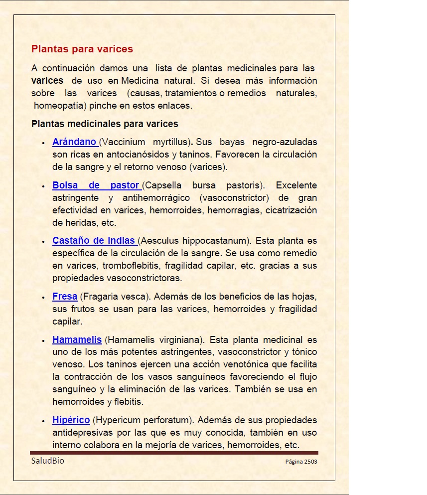 En este ejemplo, una vez estamos en la página plantas para varices si deseamos más información sobre las plantas indicadas podemos pinchar en el enlace que nos interese y nos llevará a la página que da información detallada sobre la planta medicinal.