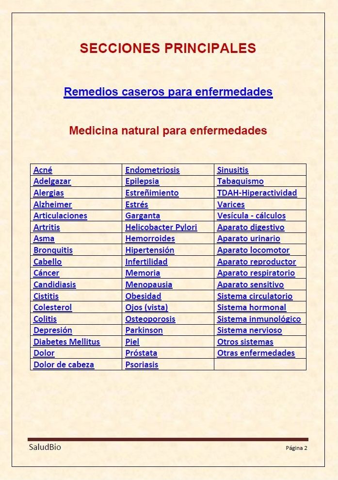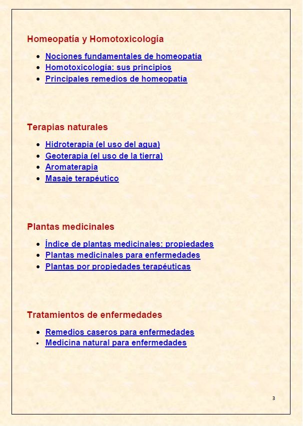 - Esta colosal obra acumula todo tipo de información sobre tratamientos de medicina natural, consejos prácticos para la salud, remedios caseros, alimentación saludable, dietas, recetas de cocina, complementos nutricionales, plantas medicinales, homeopatía, terapias, etc. etc. El tiempo y la dedicación en su elaboración creemos que no tiene precio. En esta obra encontrará toda la información necesaria para mejorar sú salud.
