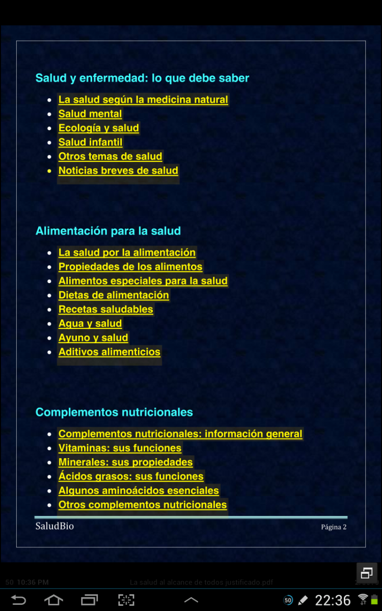 Imagínese que lo que usted desea es hacer algún tipo de dieta para adelgazar; primero en la página 2 tiene la sección "Alimentación para la salud". En esta sección elige el apartado "Dietas de alimentación", y desde este enlace podrá encontrar numerosos artículos que le indicarán qué es lo mejor para su salud usando dietas saludables. Según la aplicación o programa que use para su lectura (Moon Reader Pro, Adobe, OfficeSuite7, Quickoffice, etc.) podrá tener la oportunidad de volver con los enlaces o teclas de retroceso, al último enlace.